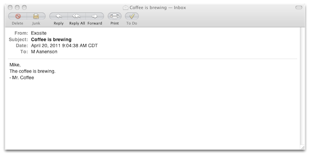 Up on the Exosite portal, I add my coffee maker as a device client and begin to see it reporting data. I can capture the on/off time using a simple event rule, which watches the data source that reports the value of the LED (high/low). I've set up my event to wait 2 minutes to go active and then it generates email alerts to everyone in the office. Everyone knows when the coffee maker is ready and they can go fill up their mugs.