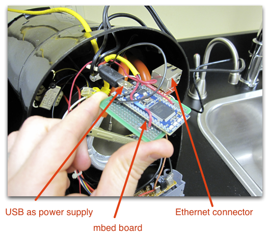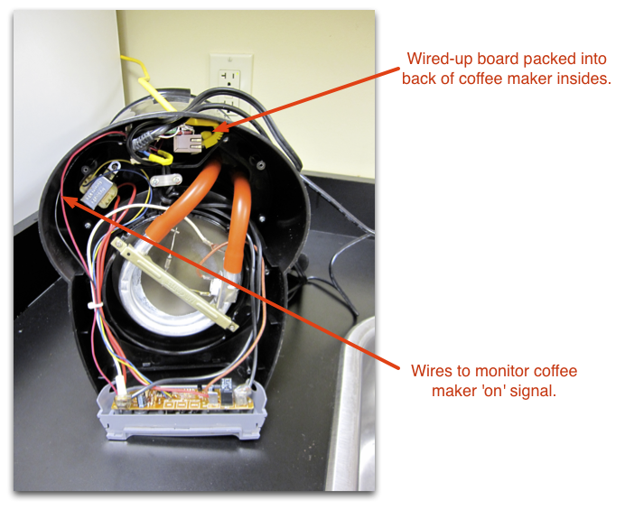 The hardest part was not wiring this up to the coffee maker's circuitry but fitting it into the plastics without burning it up from the heating element. Luckily, you'll find that if you take the bottom off of it, there is a decent amount of space in the back and a big hole where the power cable runs out. I was able to fit the Mbed board soldered onto a prototype board with an Ethernet connector in this back area of the coffee maker and fit both the Ethernet cable and a separate power supply cable (USB cable from USB wall supply) into the already existing hole in the backside. A GPIO (and ground) are connected to the coffee maker's circuit board. Although it would have been nice to use the coffee maker's electronics power supply, I found that it was not suitable for powering my mbed board in addition and for now, will just use an external supply. I had hoped to read more data from the coffee maker's little micro, but for now, I have what I want.