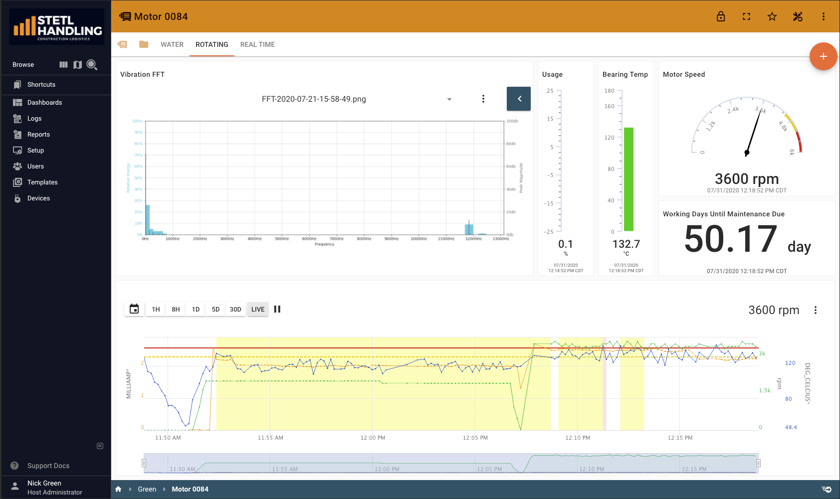 Although it’s important to receive alerts on failing equipment, ExoSense can also provide technicians with data captured over long periods of time to help diagnose and prevent further issues. This can include things like historical temperature and electrical line charts, operating plots, runtime data, vibration summary and high resolution FFTs, and more.